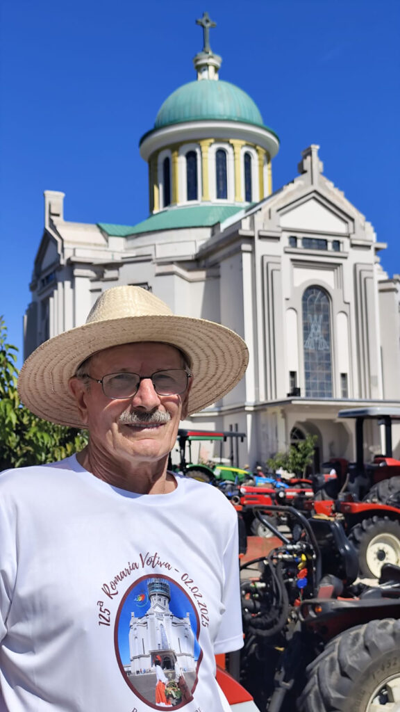 Antônio Riva – “É uma emoção muito grande participar da romaria! Hoje, eu trabalho no estacionamento das máquinas, mas desde criança já participava. Se eu não fosse uma pessoa de fé em Nossa Senhora de Caravaggio, estaria morto há 17 anos: fiquei meia hora debaixo de um trator em um acidente, ali pedi para Nossa Senhora para me salvar e assim apareceu socorro.