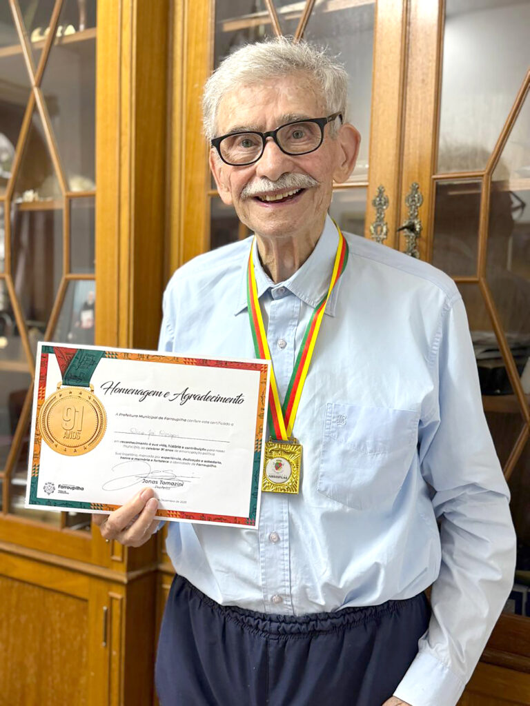 A Prefeitura Municipal homenageou Dino Dorigon, 97 anos, e outros moradores de Farroupilha com 90 anos ou mais, em comemoração aos 91 anos do Município. A cerimônia ocorreu no dia 14 de dezembro, no Largo Carlos Fetter, onde esses cidadãos receberam medalhas e certificados de agradecimento por serem testemunhas vivas de muitas histórias. — da sua, da minha e da nossa história. Na ocasião, o prefeito Jonas Tomazini ressaltou que a iniciativa buscou valorizar os cidadãos longevos de Farroupilha, reforçando o vínculo entre gerações e celebrando a trajetória de quem contribuiu para o desenvolvimento da comunidade.