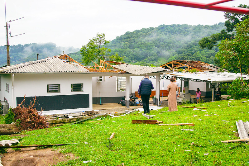 - Já bairro Imigrante as equipes atenderam ao destelhamento em uma residência e em um prédio residencial, ambos na rua Luis Sebben.