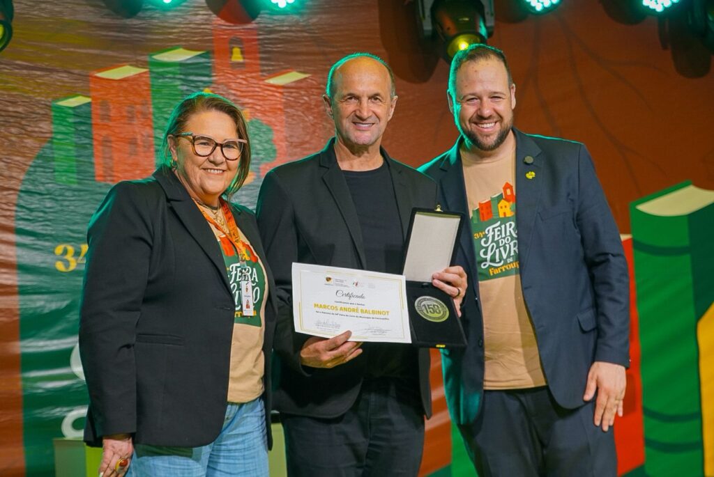 Ao final, Tomazini e a secretária de Turismo, Cultura, Esporte, Lazer e Juventude, Marli Bortolini da Silva, fizeram a entrega do certificado e de uma medalha ao patrono da 34ª Feira do Livro de Farroupilha, Marcos Balbinot. O ato foi seguido pela posse dos sete novos membros da Academia Farroupilhense de Artes Literárias e Culturais. Em apenas um ano de existência, a AFALIC se consolida como um marco no fortalecimento da literatura e demais artes, reunindo escritores, poetas, músicos e criadores culturais que dedicam seu talento à preservação da memória e à valorização da produção literária e cultural.