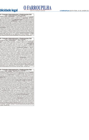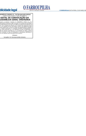 Publicidade Legal Publicidade Legal - Publicidade Legal Publicações Legais 13-03-2026 – EDITAL CHESINI março 12, 2026 O Farroupilha - Publicidade Legal Publicações Legais 06-03-2026 – BALANÇO CHESINI março 5, 2026março 5, 2026 O Farroupilha - Publicidade Legal Publicações Legais 30-01-2026 – LOJAS COLOMBO S A janeiro 29, 2026 O Farroupilha - Publicidade Legal Publicações Legais 30-01-2026 – CREDIARE janeiro 29, 2026janeiro 29, 2026 O Farroupilha - Publicidade Legal Publicações Legais 30-01-2026 – A R COLOMBO janeiro 29, 2026janeiro 29, 2026 O Farroupilha - Publicidade Legal Publicações Legais 30-01-2026 – JOSEMA janeiro 29, 2026janeiro 29, 2026 O Farroupilha - Publicidade Legal Publicações Legais 12-12-2025 – VOESTALPINE dezembro 11, 2025dezembro 11, 2025 O Farroupilha - Publicidade Legal Publicaçoes Legais 06-11-2025 – EXTRAVIO DE CONHECIMENTO DE EMBARQUE novembro 6, 2025novembro 6, 2025 O Farroupilha - Publicidade Legal Publicações Legais 05-11-2025 – EXTRAVIO DE CONHECIMENTO DE EMBARQUE novembro 5, 2025 O Farroupilha - Publicidade Legal Publicações Legais 04-11-2025 – EXTRAVIO DE CONHECIMENTO DE EMBARQUE novembro 4, 2025novembro 4, 2025 O Farroupilha - Publicidade Legal Publicações Legais – Sexta-feira, 13 de junho de 2025 – AGFAR SECURITIZADORA S A junho 30, 2025 O Farroupilha - Publicidade Legal Publicações Legais – Sexta-feira, 25 de abril de 2025 – A R COLOMBO – Balanço abril 24, 2025abril 24, 2025 O Farroupilha - Publicidade Legal Publicações Legais – Sexta-feira, 25 de abril de 2025 – LOJAS COLOMBO – Edital de Convovação abril 24, 2025abril 24, 2025 O Farroupilha - Publicidade Legal Publicações Legais – Terça-feira, 22 de abril de 2025 – Edital de Leilões abril 23, 2025abril 23, 2025 O Farroupilha - Publicidade Legal Publicações Legais – Quarta-feira, 23 de abril de 2025 – ERRATA + ADENDO AO EDITAL – EDITAL LEILOES – IMOVEIS abril 22, 2025abril 22, 2025 O Farroupilha - Publicidade Legal Publicações Legais – Terça-feira, 22 de abril de 2025 – ERRATA + ADENDO AO EDITAL – EDITAL LEILOES – IMOVEIS abril 22, 2025abril 22, 2025 O Farroupilha - Publicidade Legal Publicações Legais – Quinta-feira, 17 de abril de 2025 – ERRATA + ADENDO AO EDITAL – EDITAL LEILÕES – IMOVEIS abril 17, 2025 O Farroupilha - Publicidade Legal Publicações Legais – Quinta-feira, 17 de abril de 2025 – Edital de Leilões abril 17, 2025abril 17, 2025 O Farroupilha - Publicidade Legal Sem categoria Publicações Legais – Quinta-feira, 17 de abril de 2025 – Edital de Leilões abril 16, 2025abril 16, 2025 O Farroupilha - Publicidade Legal Publicações Legais – 17 de abril de 2025 – LOJAS COLOMBO – Edital de Convocação abril 16, 2025 O Farroupilha - Publicidade Legal Publicações Legais – Quarta-feira, 16 de abril de 2025 – Edital de Leilões (2) abril 15, 2025abril 15, 2025 O Farroupilha - Publicidade Legal Publicações Legais – Quarta-feira, 16 de abril de 2025 – Edital de Leilões abril 15, 2025abril 15, 2025 O Farroupilha - Publicidade Legal Publicações Legais – Terça-feira, 15 de abril de 2025 – Edital de Leilões abril 15, 2025abril 15, 2025 O Farroupilha - Publicidade Legal Publicações Legais – 28 de Março de 2025 – JOSEMA março 27, 2025março 27, 2025 O Farroupilha - Publicidade Legal Publicações Legais – 28 de Março de 2025 – CREDIARE março 27, 2025março 27, 2025 O Farroupilha - Publicidade Legal Publicações Legais – 28 de Março de 2025 – LOJAS COLOMBO março 27, 2025março 27, 2025 O Farroupilha - Publicidade Legal Publicações Legais – 21 de Março de 2025 – FRIGORIFICO CHESINI março 20, 2025março 20, 2025 O Farroupilha - Publicidade Legal Publicações Legais – 14 de Março de 2025 – FRIGORÍFICO CHESINI março 13, 2025 O Farroupilha - Publicidade Legal Publicações Legais – 07 de Março de 2025 – FRIGORIFICO CHESINI março 6, 2025março 6, 2025 O Farroupilha - Publicidade Legal Publicações Legais – 28 de fevereiro de 2025 – FRIGORIFICO CHESINI fevereiro 27, 2025 O Farroupilha - Publicidade Legal Publicações Legais – 11 de outubro de 2024 – CREDIARE outubro 10, 2024outubro 10, 2024 O Farroupilha - Publicidade Legal Publicações Legais – 04 de outubro de 2024 – LOJAS COLOMBO outubro 3, 2024outubro 3, 2024 O Farroupilha - Publicidade Legal Publicações Legais – 04 de outubro de 2024 – JOSEMA outubro 3, 2024outubro 3, 2024 O Farroupilha - Publicidade Legal Publicações Legais – 04 de outubro de 2024 – A R COLOMBO outubro 3, 2024 O Farroupilha - Publicidade Legal Publicações Legais – 02 de agosto de 2024 – CREDIARE agosto 1, 2024agosto 1, 2024 O Farroupilha - Publicidade Legal Publicações Legais – 26 de julho de 2024 – FRIGORIFICO CHESINI julho 25, 2024julho 25, 2024 O Farroupilha - Publicidade Legal Publicações Legais – 19 de julho de 2024 – FRIGORÍFICO CHESINI julho 18, 2024julho 18, 2024 O Farroupilha - Publicidade Legal Publicações Legais – 12 de julho de 2024 – FRIGORIFICO CHESINI julho 11, 2024 O Farroupilha - Publicidade Legal Publicações Legais – 26 de ABRIL DE 2024 – AR COLOMBO abril 25, 2024abril 25, 2024 O Farroupilha - Publicidade Legal Publicações Legais – 19 de ABRIL DE 2024 – LOJAS COLOMBO abril 18, 2024abril 18, 2024 O Farroupilha - Publicidade Legal Publicações Legais – 28 de MARÇO DE 2024 – LOJAS COLOMBO março 27, 2024março 27, 2024 O Farroupilha - Publicidade Legal Publicações Legais – 28 de MARÇO DE 2024 – JOSEMA março 27, 2024março 27, 2024 O Farroupilha - Publicidade Legal Publicações Legais – 28 de MARÇO DE 2024 – CREDIARE março 27, 2024março 27, 2024 O Farroupilha - Publicidade Legal Publicações Legais – 28 de MARÇO DE 2024 – COLOMBO MOTOS março 27, 2024março 27, 2024 O Farroupilha - Publicidade Legal Publicações Legais – 22 de MARÇO DE 2024 – CHESINI março 21, 2024março 21, 2024 O Farroupilha - Publ