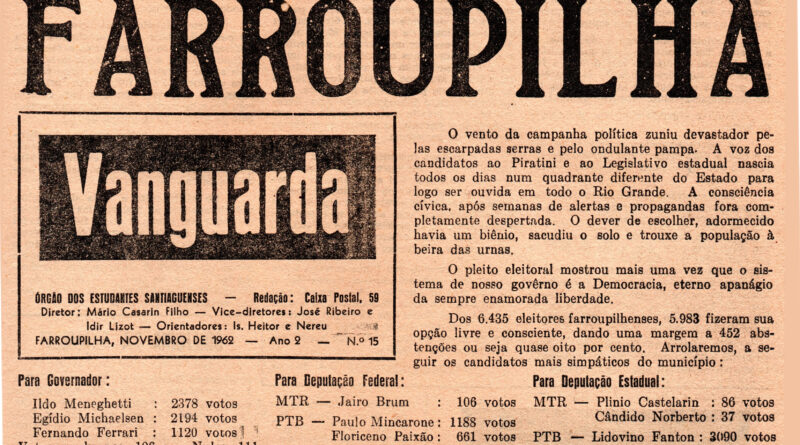 A reprodução parcial da capa do Jornal Vanguarda mostra o resultado das eleições de novembro de 1962, em Farroupilha, para governador, senador e deputados estadual e federal. Foi a última eleição antes da Revolução de 1964, quando passou a vigorar o bipartidarismo, e só dois partidos seguiram liberados pelo regime militar para atuar: Arena (a favor do governo) e MDB (oposição).