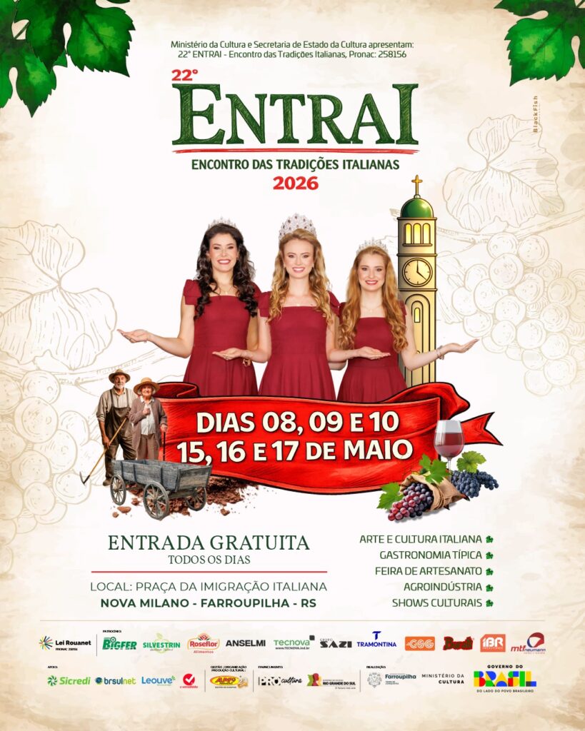 O ENTRAI será realizado em dois finais de semana, na Praça da Imigração Italiana, em Nova Milano, dias 8, 9 e 10, e 15, 16 e 17 de maio. Neste ano, o evento passa por ampliação estrutural, com o objetivo de qualificar o acolhimento ao público e otimizar a circulação de visitantes. Como novidade, a rua lateral da igreja passa a integrar o espaço do evento, abrigando o pavilhão de shows e o palco principal.