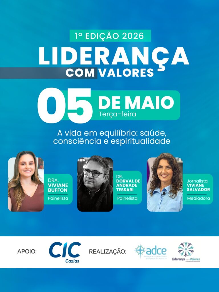 A primeira edição de 2026 do projeto Liderança com Valores, promovido pela ADCE Caxias do Sul, já tem data marcada. O encontro será no dia 5 de maio (terça-feira), no auditório da CIC, em Caxias do Sul, e terá como tema “A vida em equilíbrio: saúde, consciência e espiritualidade”. A proposta desta edição é promover uma reflexão sobre pilares fundamentais para uma vida mais plena e para o exercício de uma liderança mais humana, consciente e conectada com valores essenciais. O painel contará com a participação da médica Viviane Buffon e do médico Dorval de Andrade Tessari, com mediação da jornalista Viviane Salvador.