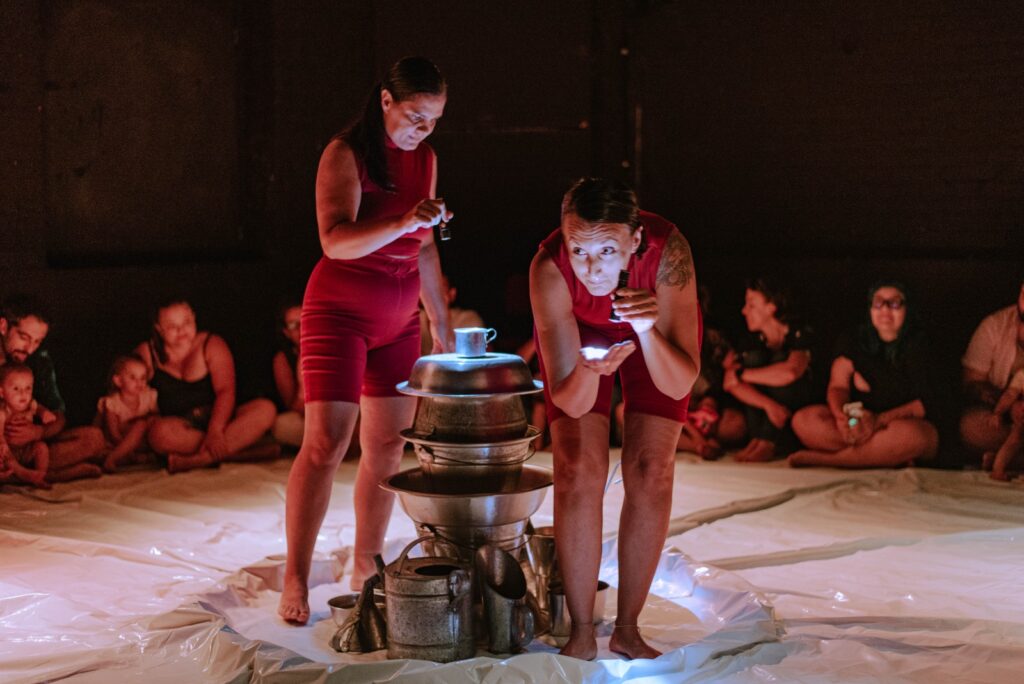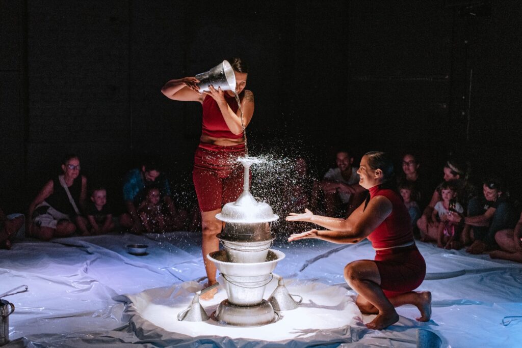 “Mais do que uma brincadeira, o espetáculo é resultado de uma investigação artística profunda, que respeita e valoriza o olhar, a escuta e a percepção dos bebês. Em cena, elementos não convencionais, como baldes, bacias e canecas de metal, cenários e figurinos neutros, se combinam, com ou sem água, para gerar estímulos sonoros, visuais e sensoriais que convidam à curiosidade e ao brincar”, pontua Caliandra. Realizado e produzido pela Complô Cunhã, “Chuá – descobertas na água” dá continuidade a uma pesquisa iniciada em 2011 com o espetáculo “Cuco – a linguagem dos bebês no teatro”, que teve participação das atrizes de Chuá e do pesquisador Paulo Fochi.