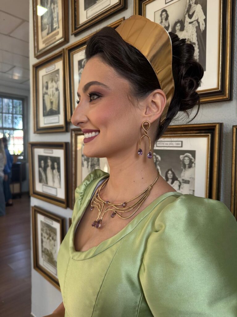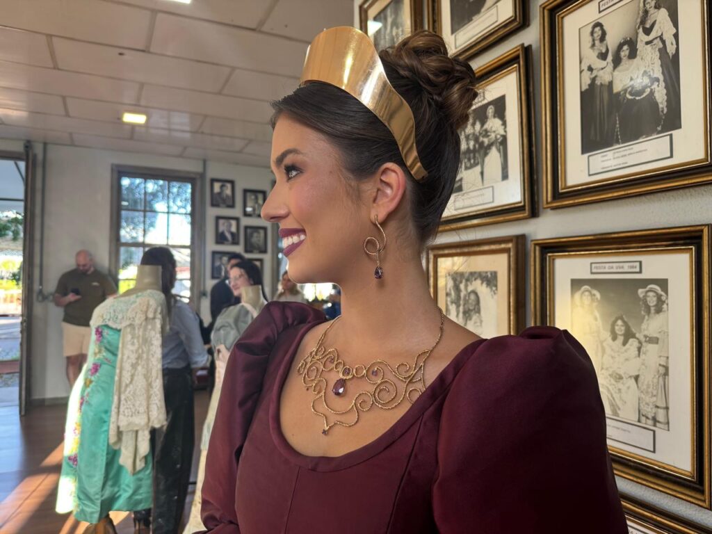 - Para a Comissão Social, as joias reforçam o significado simbólico dos trajes oficiais. “Cada detalhe foi pensado para contar uma história. As joias não são apenas complementos estéticos, elas carregam identidade, memória e emoção. Representam o cuidado com a tradição e o respeito à história que a Festa da Uva destaca”, diz Elisa Kuver.
