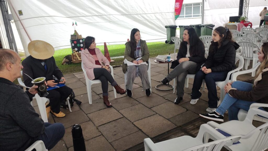 Sobre crônica e conto, ela explicou que a crônica envolve a percepção de fatos, de uma história do dia a dia. O conto, por sua vez, cria uma história fictícia, embora possa ser inspirado na realidade, não tem compromisso com a mesma. Entre outras afirmações, Claudia Iembo disse que a escrita deve ter um propósito. “Cada autor deve identificar a sua forma de escrever, o seu estilo e o seu propósito, o porquê ele escreve”. O pate papo contou com a presença do patrono da Feira do Livro de Farroupilha, Marcos Balbinot.