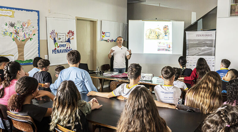 Quatro escolas de Bento Gonçalves integraram um roteiro de palestras sobre a narrativa histórica da Fenavinho, evento diretamente responsável pela evolução social e econômica do município. A iniciativa compõe o conjunto de ações do projeto aprovado pela Lei Federal de Incentivo à Cultura (Lei Rouanet) para produção do livro “Fenavinho – Mais do que uma festa”, de autoria dos jornalistas Fabiano Mazzotti e Itacyr Giacomello.