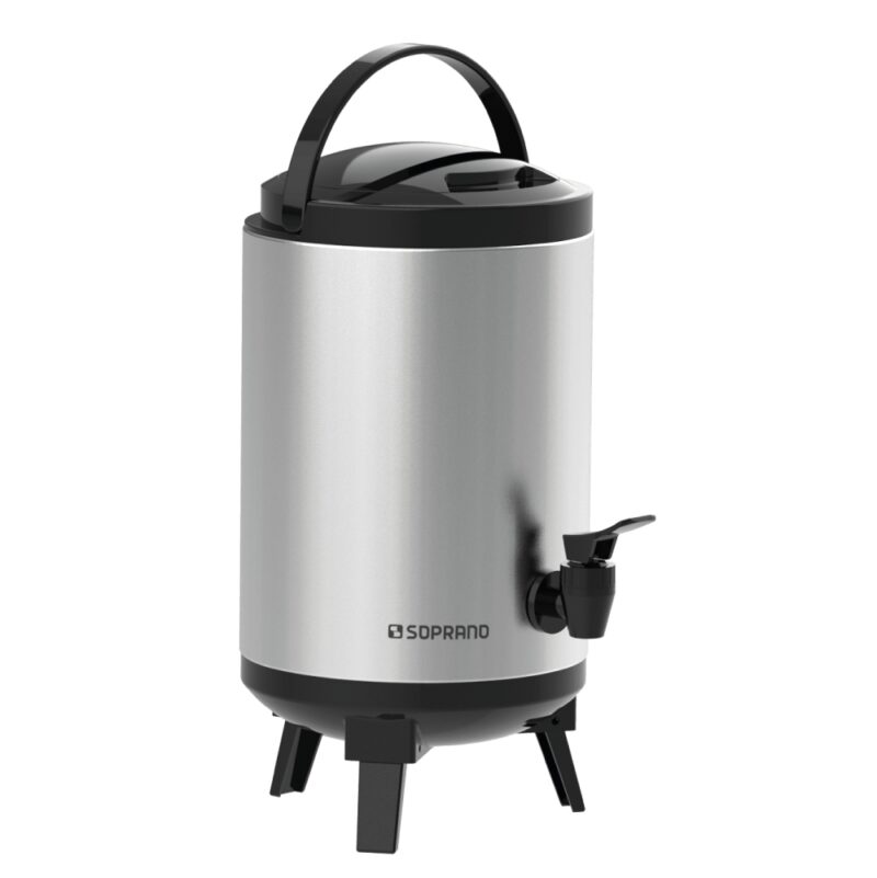 Por fim o botijão térmico Palace 4 litros, novidade em versões de 6 litros e 9,5 litros. Desenvolvido em inox, alumínio e polipropileno livre de BPA, se destaca pelo isolamento em poliuretano (PU), que mantém líquidos quentes ou frios por até 10 horas. Funcional e prático, possui bocal largo para facilitar a adição de gelo, alça de transporte, pés retráteis para estabilidade e porta-sachê integrado. O acabamento em inox com verniz garante sofisticação e evita manchas, tornando-o ideal para grandes volumes.