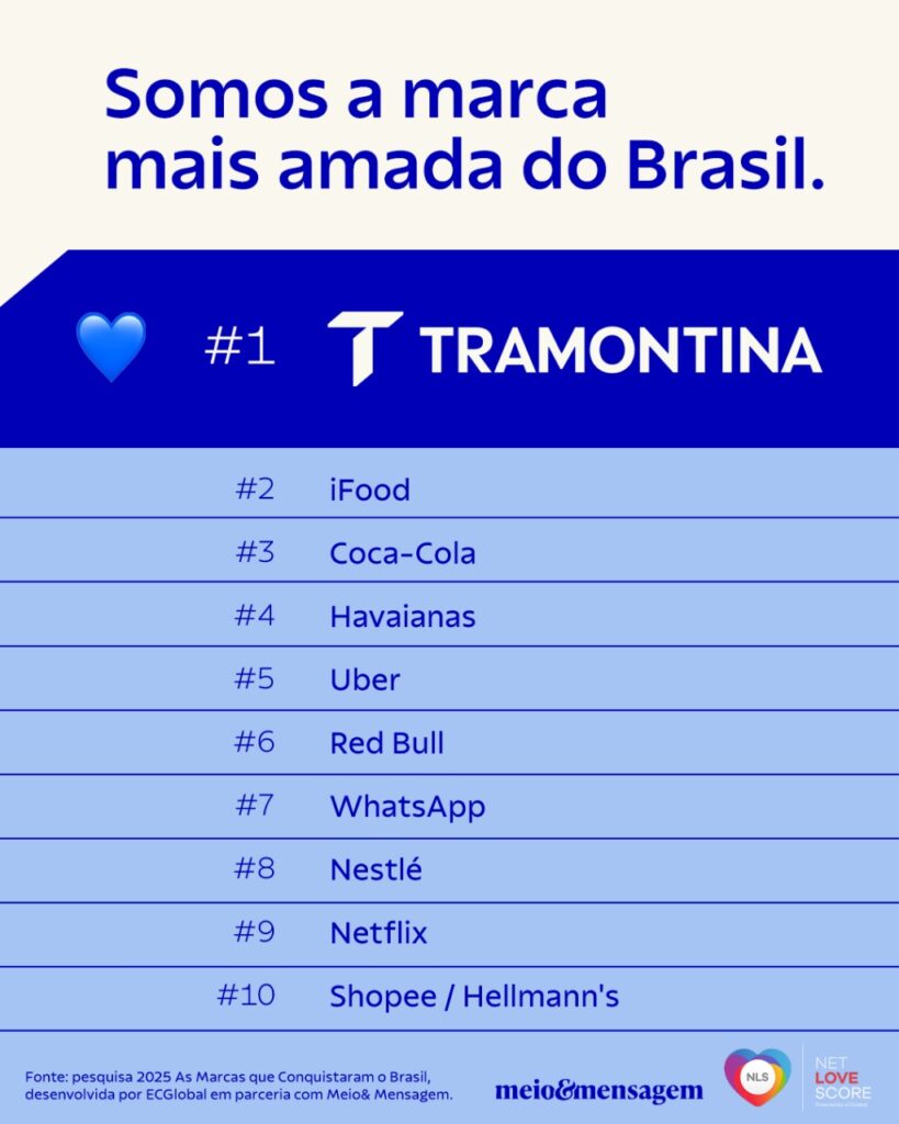 A estreia da Tramontina na pesquisa anual da Ecglobal em parceria com a Meio & Mensagem acompanha a conquista do primeiro lugar como Marca Mais Amada pelos Brasileiros em 2025. O estudo “As Marcas que Conquistaram o Brasil” identifica as que se conectaram com os brasileiros e conquistaram seu engajamento. Além da liderança no Top 10 Love Brands – colocando a Tramontina à frente de iFood, Coca-Cola, Havaianas, Uber e outras com vantagem superior a 20 pontos – a marca também é campeã na categoria recém adicionada de “utensílios domésticos”.