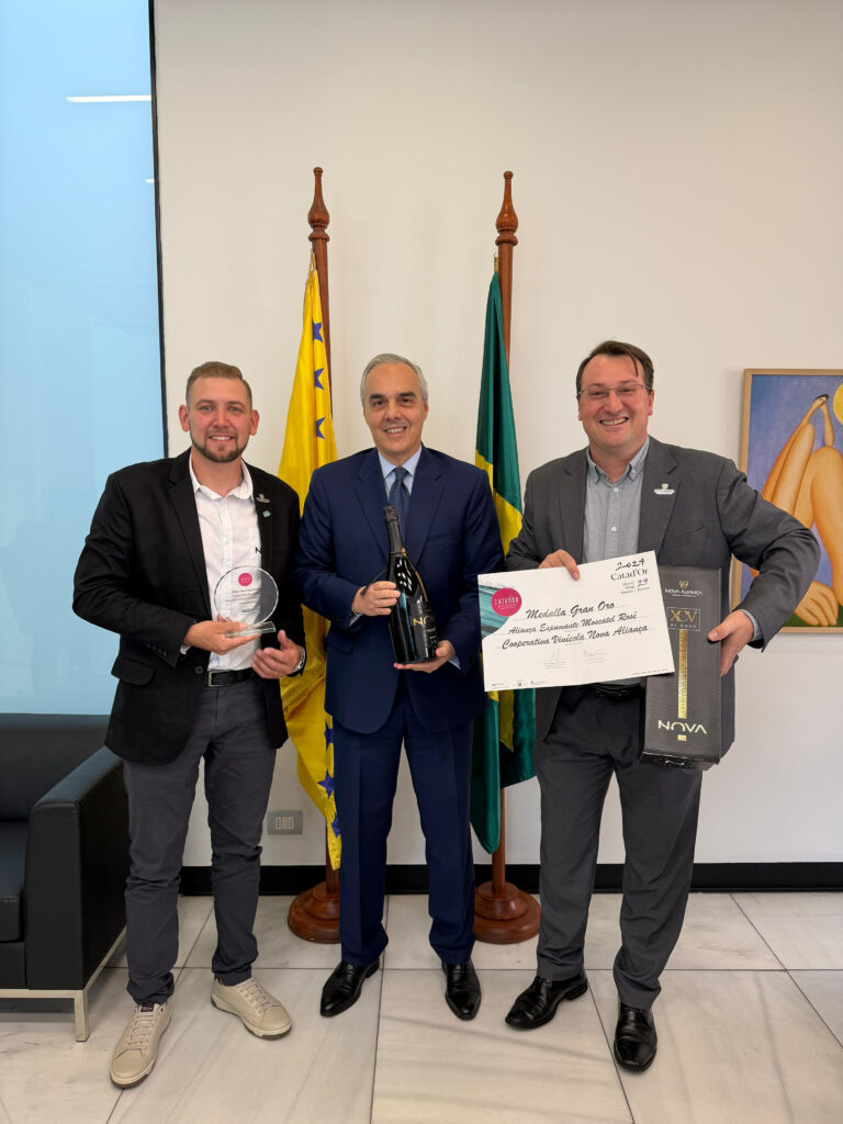 Durante a estada no país, Fleck e Facchin foram recebidos pelo Embaixador do Brasil no Chile, Paulo Roberto Soares Pacheco, na Embaixada Brasileira em Santiago, em um encontro que celebrou o destaque internacional da vinícola e o trabalho das mais de 600 famílias cooperadas. Em um gesto repleto de significado, o embaixador entregou aos representantes da Nova Aliança os troféus e certificados conquistados no Catad’Or 2024, quando o Espumante Aliança Moscatel Rosé foi eleito o Melhor da América Latina.